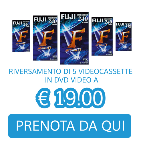 Portaci 5 Videocassette!! Trasformeremo i tuoi ricordi in splendidi DVD Video. Nelle pause di tutti i giorni ci occupiamo dei vostri ricordi. Prezzo relativo a 5 Videocassette. Promo Super5 |